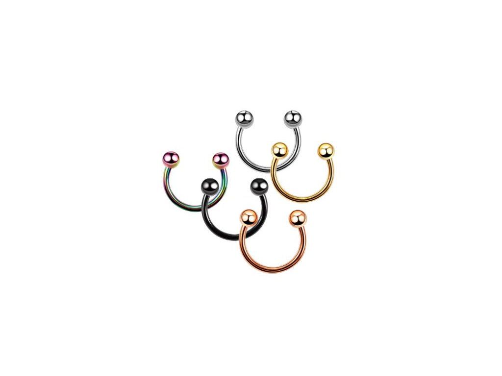 Šperk je vyroben z chirurgické oceli 316L a dostupný v barevných variantách stříbrná, zlatá, černá, duhová a modrá. Průměr drátu je 1,2 mm, vnitřní průměry podkovy jsou 6 mm, 8 mm a 10 mm a zakončení tvoří dvě kuličky o velikosti 3 mm.