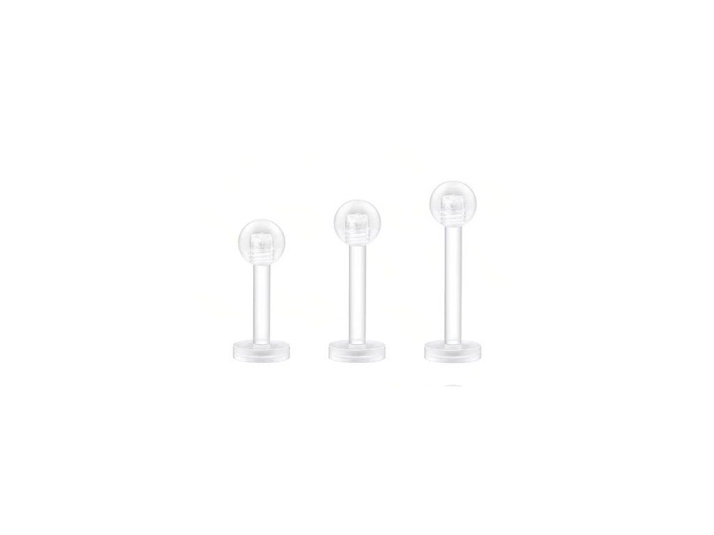 Materiál plast. Barva transparentní (průhledná) nebo černá. Průměr drátu 1,2 mm. Délky labrety 6 mm, 8 mm, 10 mm a 12 mm. Velikost kuličky 3 mm.
