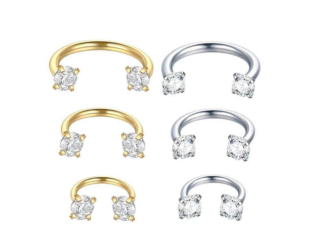 Na koncích podkovy jsou osazeny zirkony o velikosti 3 mm, které dodávají šperku elegantní vzhled bez působení laciného efektu. Díky tomu je vhodná jak pro minimalistické aplikace, tak pro klienty, kteří požadují jemný lesk. Dostupné provedení v titanové i zlaté barvě umožňuje snadné přizpůsobení preferencím klienta.
