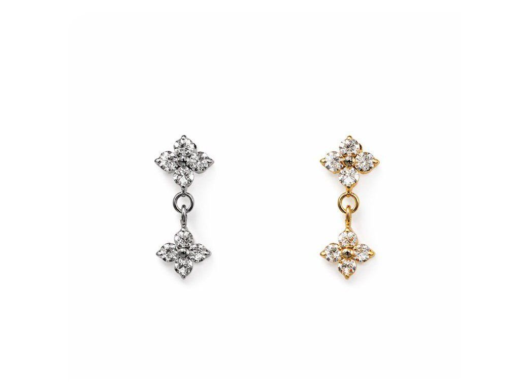 Horní čtyřlístek o velikosti 5,3 mm tvoří pevnou základnu, zatímco spodní visící čtyřlístek o velikosti 4,3 mm vytváří jemný pohyb při každém pohybu hlavy. Tento detail zvyšuje vizuální atraktivitu a působí elegantně bez přehnané výraznosti.