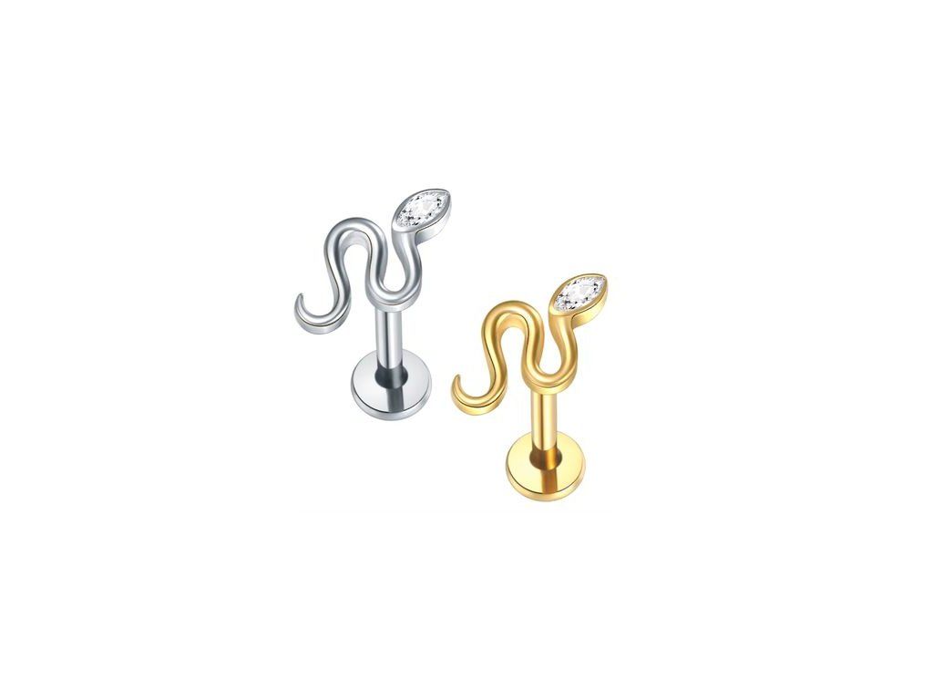 Ozdobná část o velikosti 5,5 × 10 mm vytváří kompaktní, ale stále dobře čitelný dekorativní prvek vhodný zejména pro helix, flat nebo lobe aplikace. Menší rozměr zajišťuje pohodlné nošení a snižuje riziko zachytávání. Motiv hada je dlouhodobě populární díky své symbolice a nadčasovému vzhledu.
