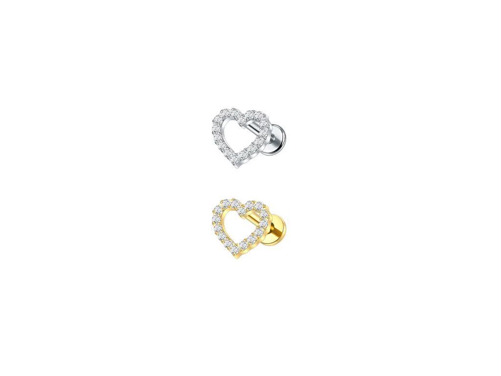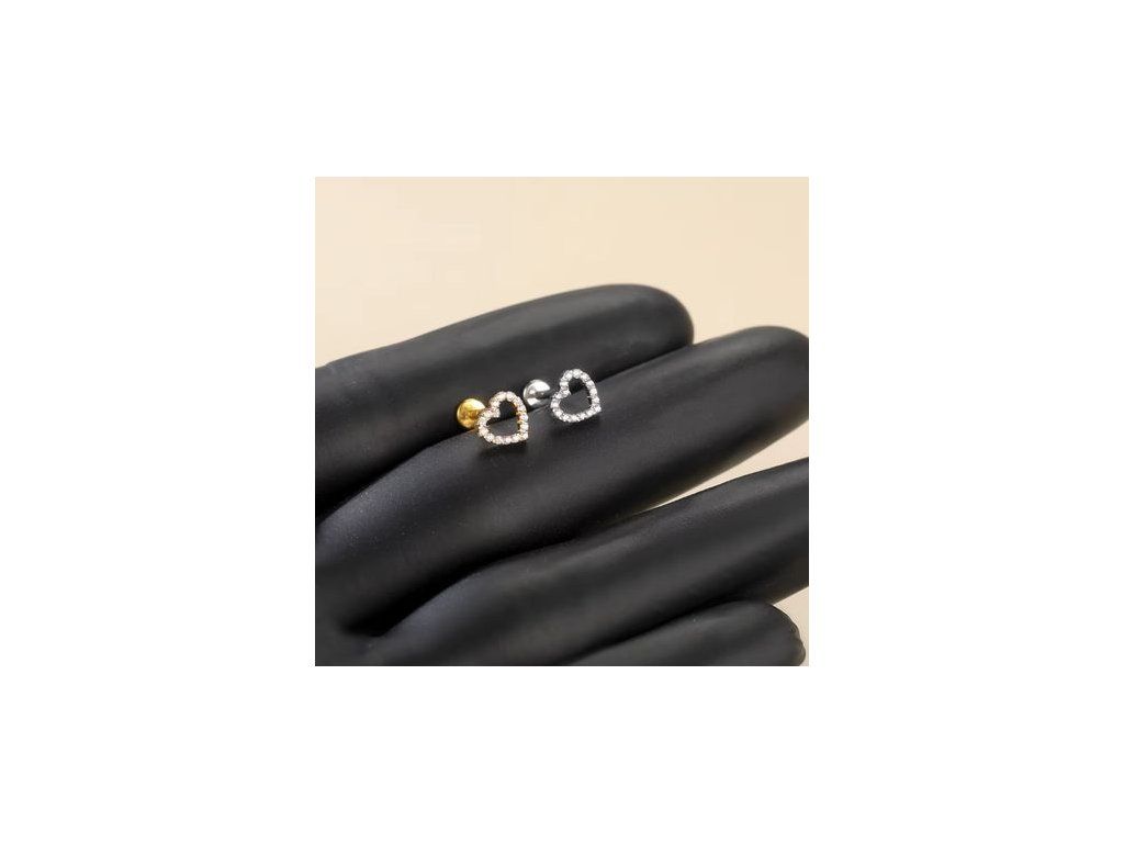 Ozdobná titanová labreta 1,2 mm s obrysem srdíčka vyplněným kamínky. Jemný romantický motiv je ideální do helixu, tragusu i lobe a funguje jako výrazný, ale stále elegantní detail v ušních kompozicích.
