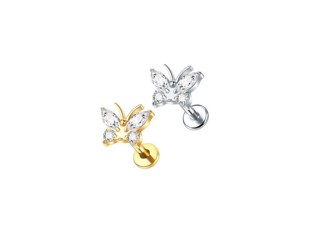 Dekorativní labreta s motivem motýlka v detailnějším provedení s tykadly působí jemně, ale zároveň výrazněji než minimalistická varianta bez detailů. Silueta je čitelná a elegantní, díky čemuž se velmi dobře uplatní v ušních aplikacích, kde klienti hledají kombinaci romantiky a precizního zpracování.
