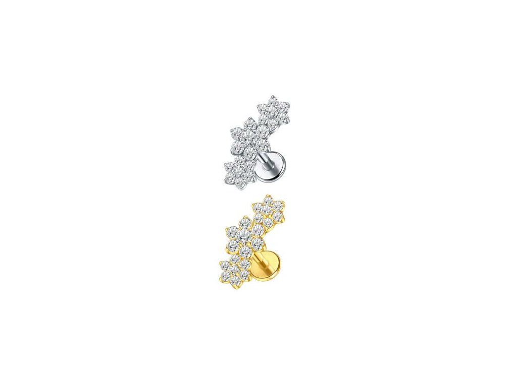 Květinové motivy patří mezi dlouhodobě nejprodávanější tvary v ušních piercingových kompozicích. Model zvyšuje atraktivitu nabídky a dobře se kombinuje s minimalistickými kuličkami i kamínky.
