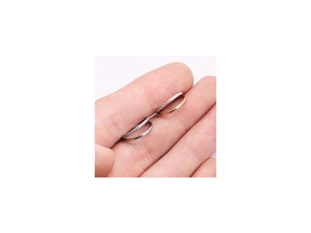 Jedna linie čirých kamínků osazená do ostré V siluety vytváří dynamičtější efekt oproti klasickému oblouku. Vhodné pro klienty hledající výraznější konturu šperku.