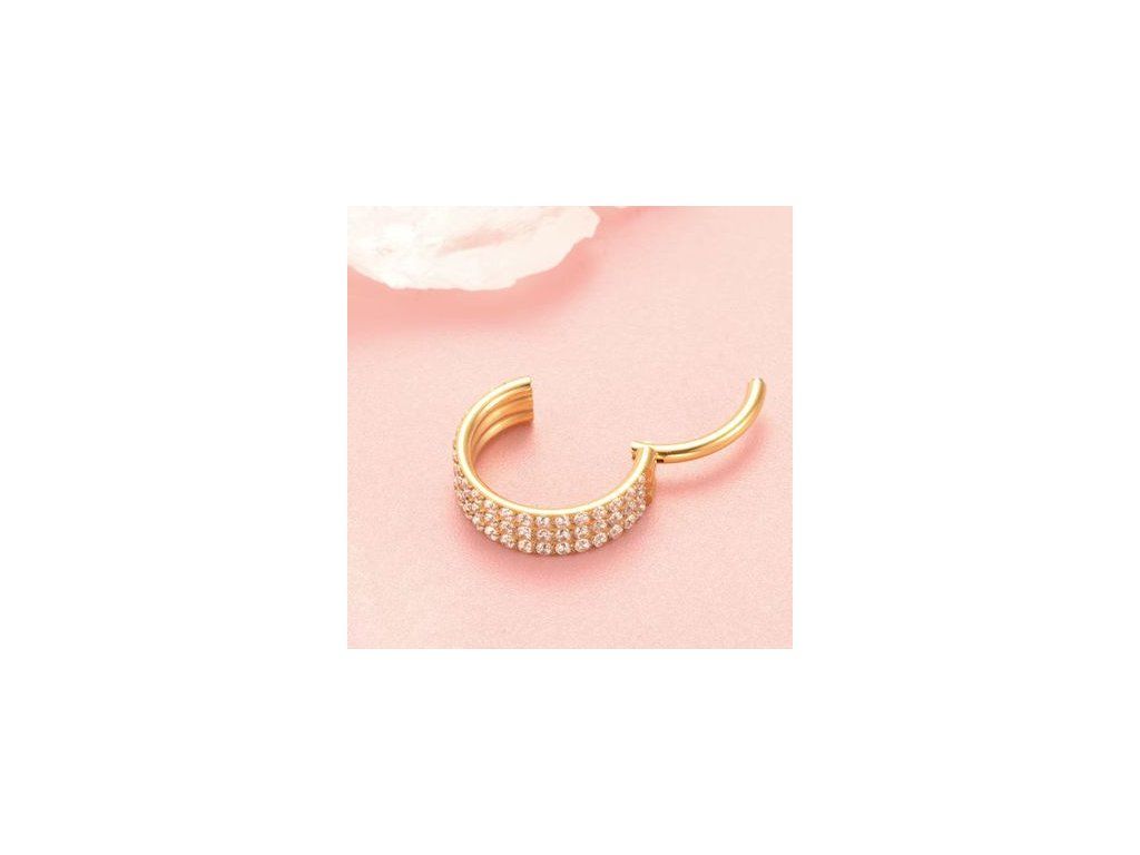 Titanový segment 1,2 mm s trojitou řadou čirých kamínků je výrazná dekorativní varianta kruhového šperku určená pro piercingová studia, která chtějí nabídnout prémiový, vizuálně dominantní model v biokompatibilním materiálu. Kombinuje plně osazený design s profesionální segmentovou konstrukcí bez viditelného spoje.