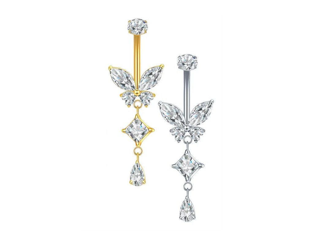 Titanový piercing do pupíku s ozdobou visícího motýlka s dvěma zirkony různého tvaru