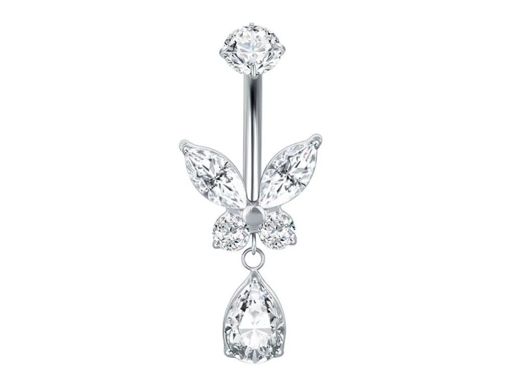 Motýlí motiv patří mezi oblíbené designy v kategorii piercing do pupíku. Varianta se dvěma zirkony působí elegantněji a subtilněji než bohatě zdobené modely, což rozšiřuje sortiment o univerzální a dobře prodejnou designovou variantu.