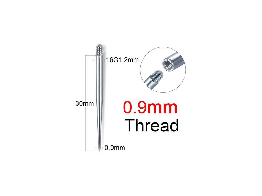 Průměr taperu je 1,2 mm a vnitřní průměr závitové části 0,9 mm. Určeno pro titanové komponenty se shodným závitem. Není kompatibilní s ocelovými šperky.